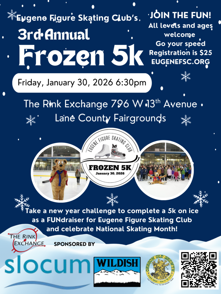 Welcome to the Eugene Figure Skating Club’s 3rd Annual Frozen 5k. Get ready, get set, skate! Take a new year challenge to complete a 5k on ice as we raise money for the Eugene Figure Skating Club and celebrate National Skating Month. Our event will be held on Friday, January 30th, 2026 from 6:30-8:30pm.