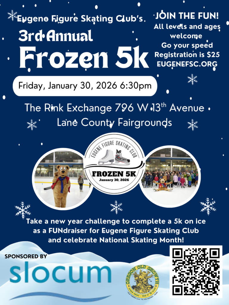 Welcome to the Eugene Figure Skating Club’s 3rd Annual Frozen 5k. Get ready, get set, skate! Take a new year challenge to complete a 5k on ice as we raise money for the Eugene Figure Skating Club and celebrate National Skating Month. Our event will be held on Friday, January 30th, 2026 from 6:30-8:30pm.